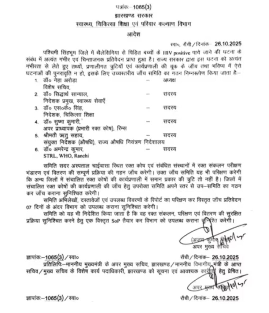 गौरतलब है कि इस मामले पर मुख्यमंत्री हेमंत सोरेन ने भी कड़ा रुख अपनाते हुए चाईबासा सदर अस्पताल के सिविल सर्जन सहित कई पदाधिकारियों को निलंबित करने का आदेश दिया है।इसके अलावा, राज्य सरकार ने प्रभावित बच्चों के लिए बड़े फैसले लिए हैं जिसमें पीड़ित बच्चों के परिवारों को 2-2 लाख रुपये की आर्थिक सहायता राशि देने की घोषणा की गई है। एचआईवी पॉजिटिव रक्त चढ़ाने से प्रभावित बच्चों का पूरा इलाज राज्य सरकार अपने खर्च पर कराएगी।इस घटना ने स्वास्थ्य विभाग की कार्यशैली और रक्त सुरक्षा मानकों पर गंभीर सवाल खड़े कर दिए हैं। अब सभी की निगाहें स्वास्थ्य विभाग की जांच रिपोर्ट पर टिकी हैं, जिसके बाद जिम्मेदारों पर और सख्त कार्रवाई होने की संभावना है।