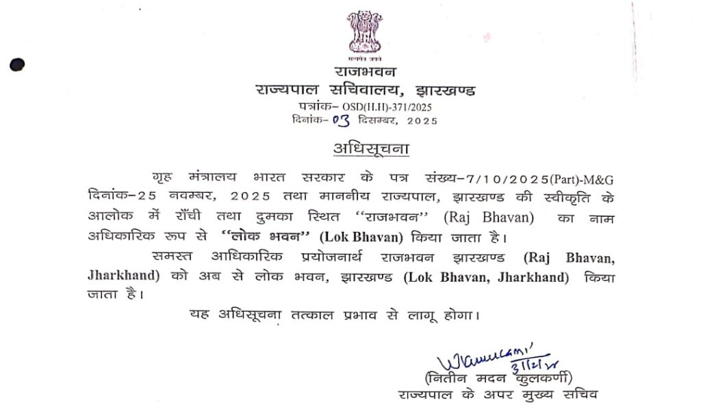 यह नाम परिवर्तन केंद्रीय गृह मंत्रालय के निर्देश के बाद किया गया है। यह अधिसूचना झारखंड के राज्यपाल के अपर मुख्य सचिव नितिन मदन कुलकर्णी के हस्ताक्षर से जारी की गई है।अधिसूचना में स्पष्ट किया गया है कि राजभवन का नाम बदलकर ‘लोक भवन’ करने का यह निर्देश तत्काल प्रभाव से लागू कर दिया गया है।