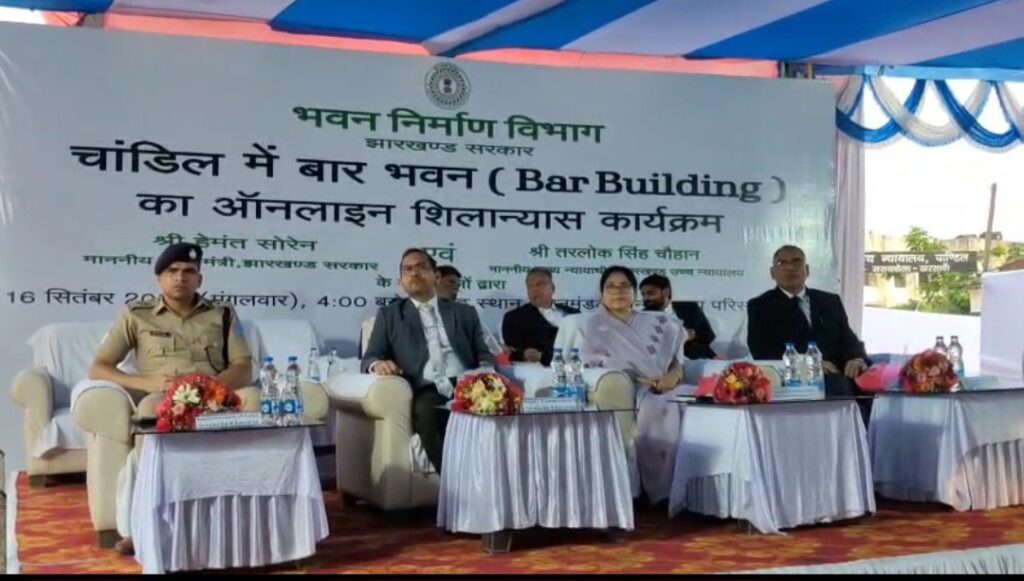 सरायकेला।झारखंड के मुख्यमंत्री हेमंत सोरेन ने मंगलवार को राज्य के तीन जिलों – खूंटी, चाईबासा और सरायकेला के चांडिल में नए बार भवन की ऑनलाइन आधारशिला रखी। इस कार्यक्रम में झारखंड हाई कोर्ट के मुख्य न्यायाधीश तरलोक सिंह चौहान, तीनों जिलों के प्रधान न्यायाधीश, बार एसोसिएशन के पदाधिकारी और जनप्रतिनिधि भी मौजूद रहे।