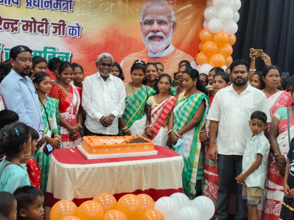 सरायकेला। स्थानीय टाउन हॉल में गुरुवार को देश के प्रधानमंत्री नरेंद्र मोदी का 75वां जन्मदिन विशेष रूप से मनाया गया। इस अवसर पर आदिवासी सांवता सुशार अखाड़ा की महिला समिति द्वारा कार्यक्रम का आयोजन किया गया। कार्यक्रम में आदिवासी महिलाओं और बच्चों ने केक काटकर प्रधानमंत्री को शुभकामनाएं दीं और केंद्र सरकार द्वारा आदिवासी समाज के उत्थान के लिए किए जा रहे कार्यों की सराहना की।