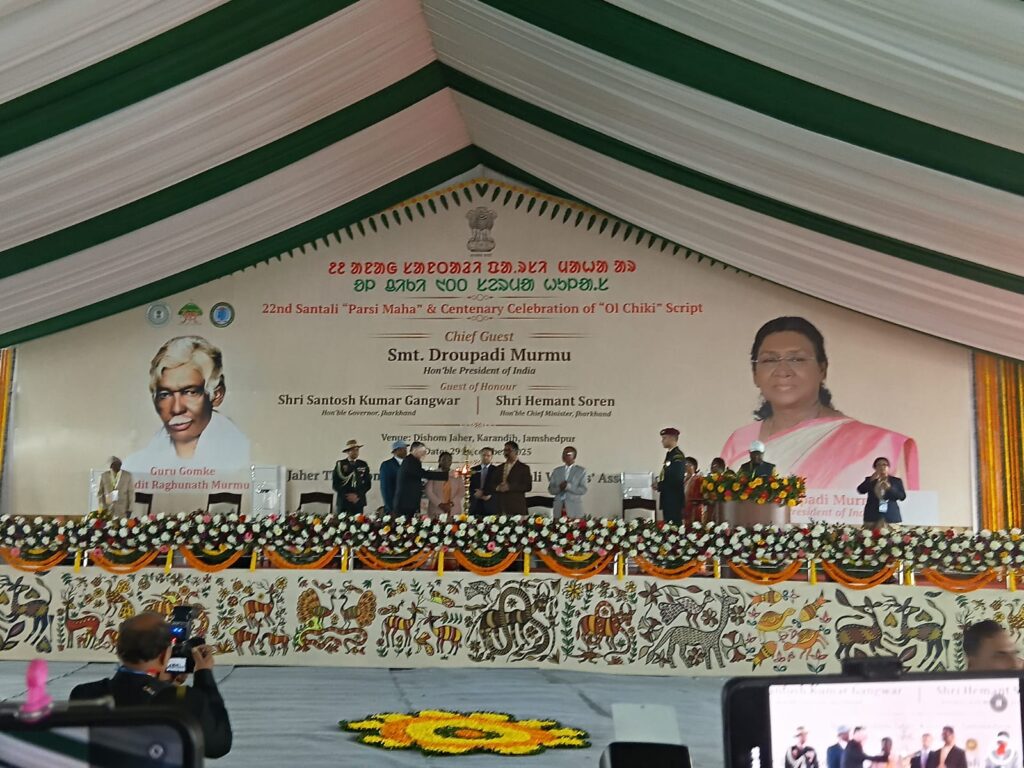 जमशेदपुर : लौहनगरी जमशेदपुर के करनडीह स्थित दिशोम जाहेर आज इतिहास के सुनहरे पन्नों में दर्ज हो गया। देश की राष्ट्रपति द्रौपदी मुर्मू अब मुख्य मंच पर पहुंच चुकी हैं। उनके मंच पर आते ही पूरा परिसर तालियों की गड़गड़ाहट और पारंपरिक जयघोष से गूंज उठा। राष्ट्रपति के साथ झारखंड के राज्यपाल और मुख्यमंत्री हेमंत सोरेन ने संयुक्त रूप से ओलचिकी लिपि के शताब्दी समारोह का विधिवत उद्घाटन किया।