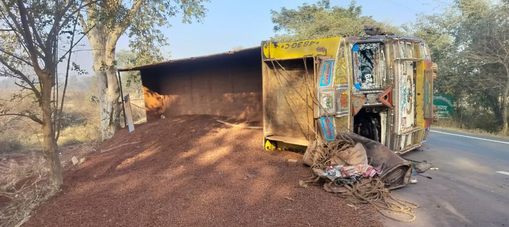 इसी दौरान सामने से अचानक एक अन्य वाहन आ गया। विपरीत दिशा से आ रही गाड़ी को बचाने के चक्कर में ट्रक अनियंत्रित हो गया। चालक ने ट्रक को सड़क किनारे गहरे गड्ढे में गिरने और पेड़ से टकराने से बचाने के लिए जैसे ही ब्रेक मारा, भारी लोड होने के कारण ट्रक बीच सड़क पर ही पलट गया।