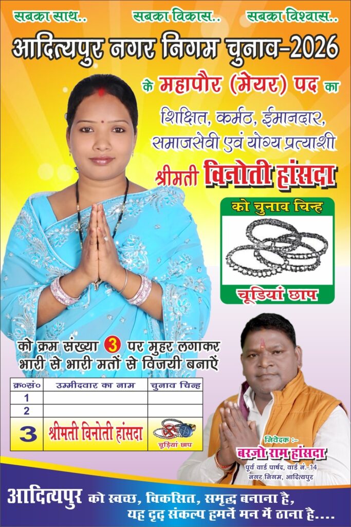 भारतीय जनता पार्टी की सक्रिय सदस्य और महिला मोर्चा की पूर्व कार्यसमिति सदस्य रहीं बिनोती हाँसदा को समाज के हर वर्ग का समर्थन मिल रहा है। उनके पति और वार्ड नंबर-14 के पूर्व पार्षद बरजो राम हाँसदा भी चुनाव प्रचार की कमान संभाले हुए हैं।बिनोती हाँसदा ने मतदाताओं से आग्रह किया है कि क्रम संख्या 3 पर अंकित उनके चुनाव चिह्न “चूड़ियां छाप” पर मुहर लगाकर उन्हें भारी मतों से विजयी बनाएं।