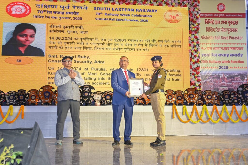 जमशेदपुर/कोलकाता: दक्षिण पूर्व रेलवे जोन के विभिन्न स्टेशनों और विभागों में अपनी कर्तव्यनिष्ठा व उत्कृष्ट सेवा से मिसाल पेश करने वाले 81 अधिकारियों एवं कर्मचारियों को मंगलवार को सम्मानित किया गया। जोन मुख्यालय में आयोजित एक भव्य समारोह के दौरान रेल जीएम एके मिश्रा ने इन रेलकर्मियों को वर्ष 2024-25 सत्र के लिए प्रशस्ति पत्र और पुरस्कार प्रदान किए।